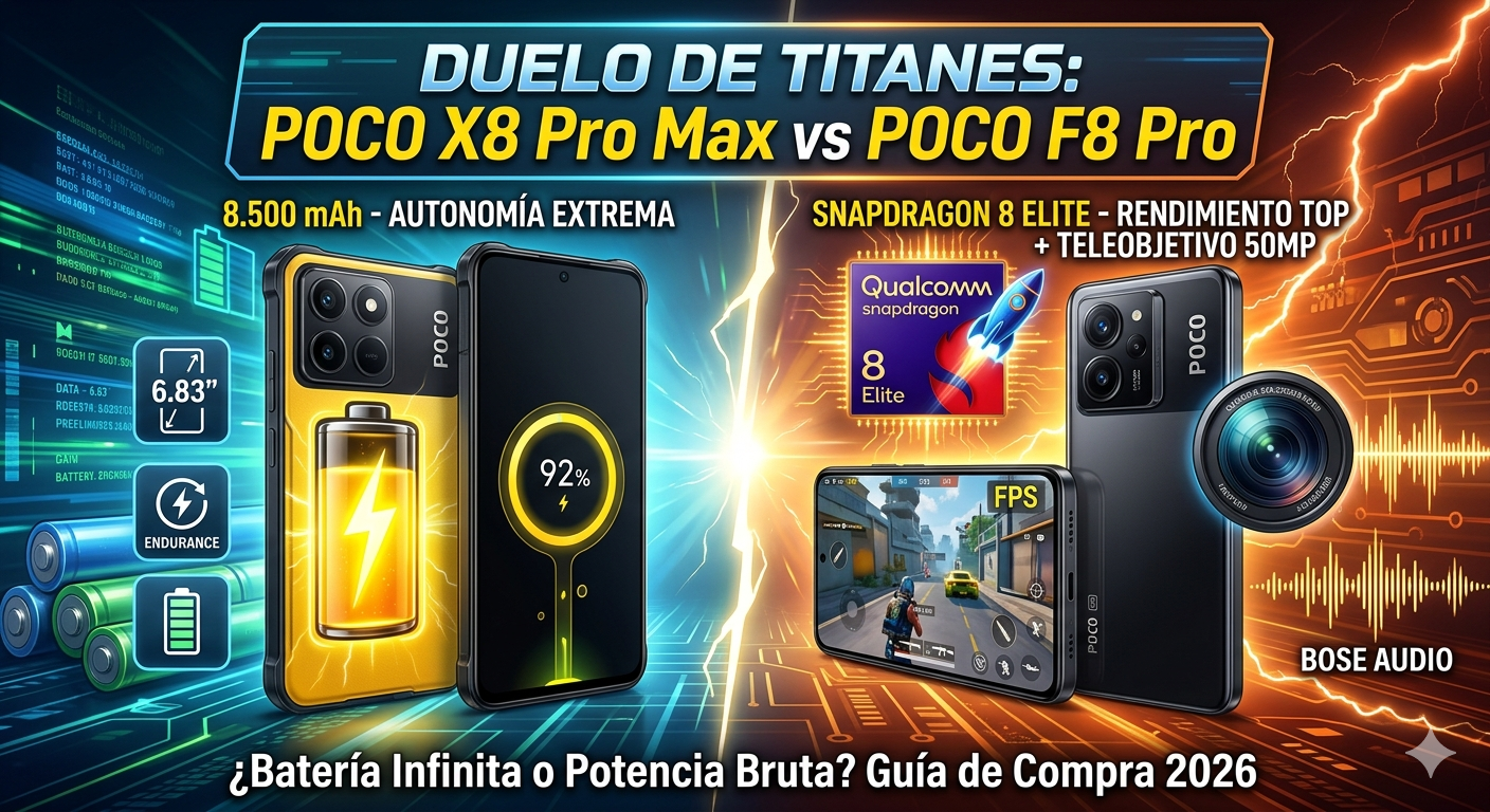 POCO X8 Pro Max vs POCO F8 Pro: ¿Batería infinita o potencia bruta? Guía de compra 2026, Si estás buscando renovar tu móvil este 2026, lo más probable es que POCO esté en tu radar. La marca ha vuelto a romper el mercado con dos bestias que, aunque se parecen en el nombre, van dirigidas a públicos totalmente distintos: el POCO X8 Pro Max y el POCO F8 Pro.